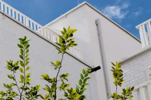 - Wärmedämm-Verbundsystem (StoTherm Mineral), Klinkerriemchen (StoBrick Ft. Weiß), Putzoberfläche (Sto-Silkolit 1,5, StoSignature Texture „Rough 1“, im Ft. Weiß)